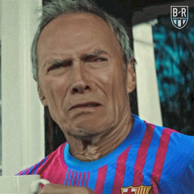 伊斯特伍德老爷子的“痛苦面具”,和巴萨的球衣简直绝配↑